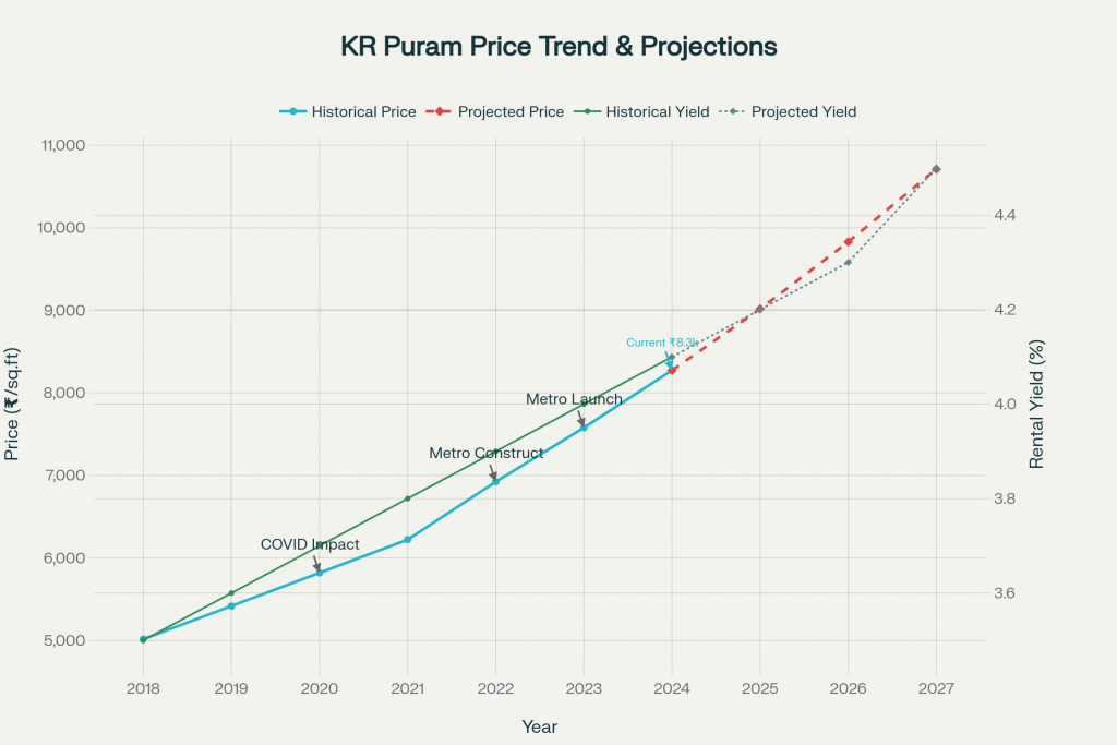 KR Puram has witnessed sustained price appreciation over the past eight years, reflecting its evolving infrastructure and growing residential demand. The table below chronicles average price per square foot, annual growth rates and key catalysts: