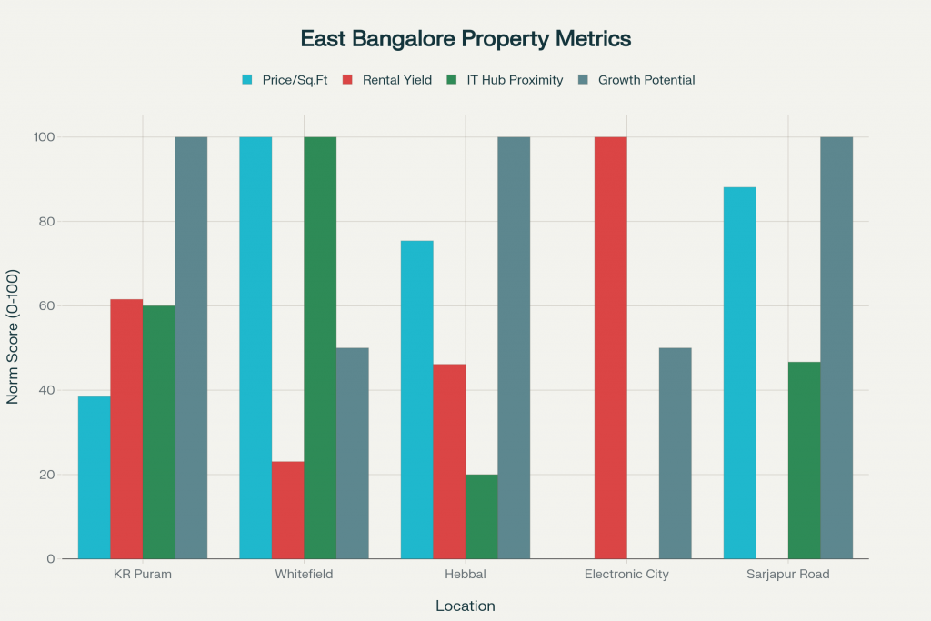 When benchmarked against other key micro-markets in East Bengaluru, KR Puram demonstrates a balanced profile of price, yield, and growth potential. The table below illustrates a comparative snapshot of average prices, rental yields, transit connectivity, proximity to IT hubs, and qualitative growth prospects.