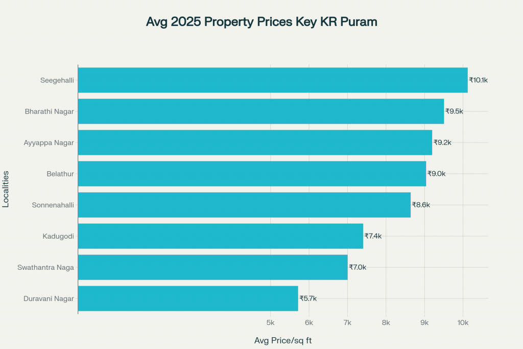 Residential property prices in KR Puram demonstrate significant variation across its micro-localities. Seegehalli and Bharathi Nagar, the most premium pockets, command average rates above ₹9,500 per sq ft, whereas Hale Devasandra and Duravani Nagar remain comparatively affordable below ₹6,000 per sq ft.